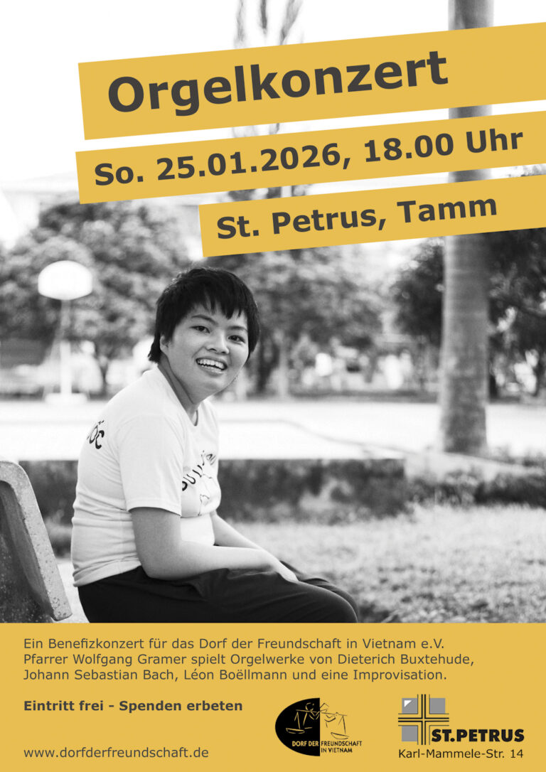 Am Sonntag, 25.01.2026 findet um 18.00 Uhr ein Orgelkonzert in der St. Petrus Kirche in Tamm statt, der Erlös kommt dem Dorf der Freundschaft zugute.